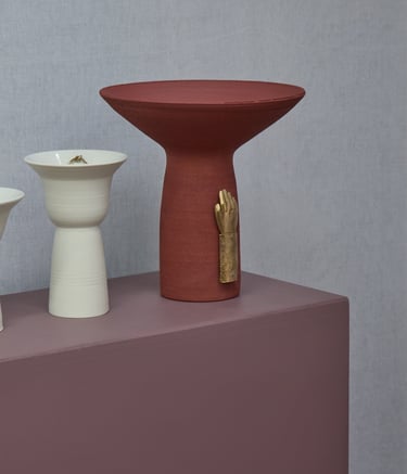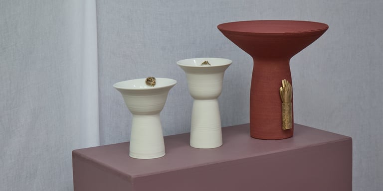 Wheel thrown stoneware, botanicals, porcelain, 22ct gold lustre